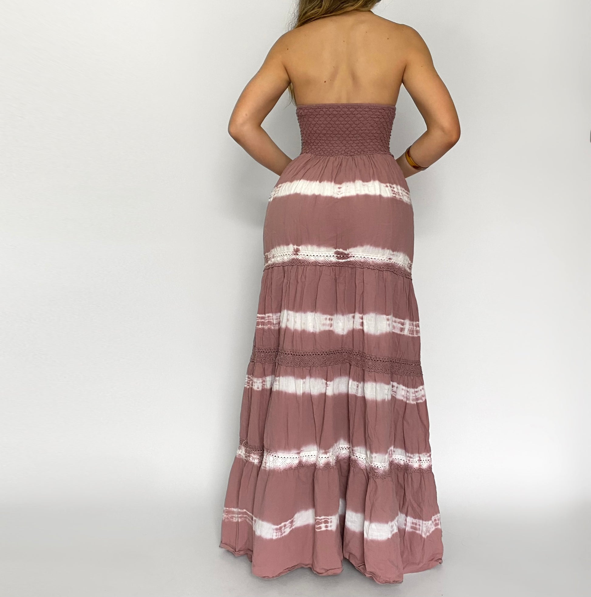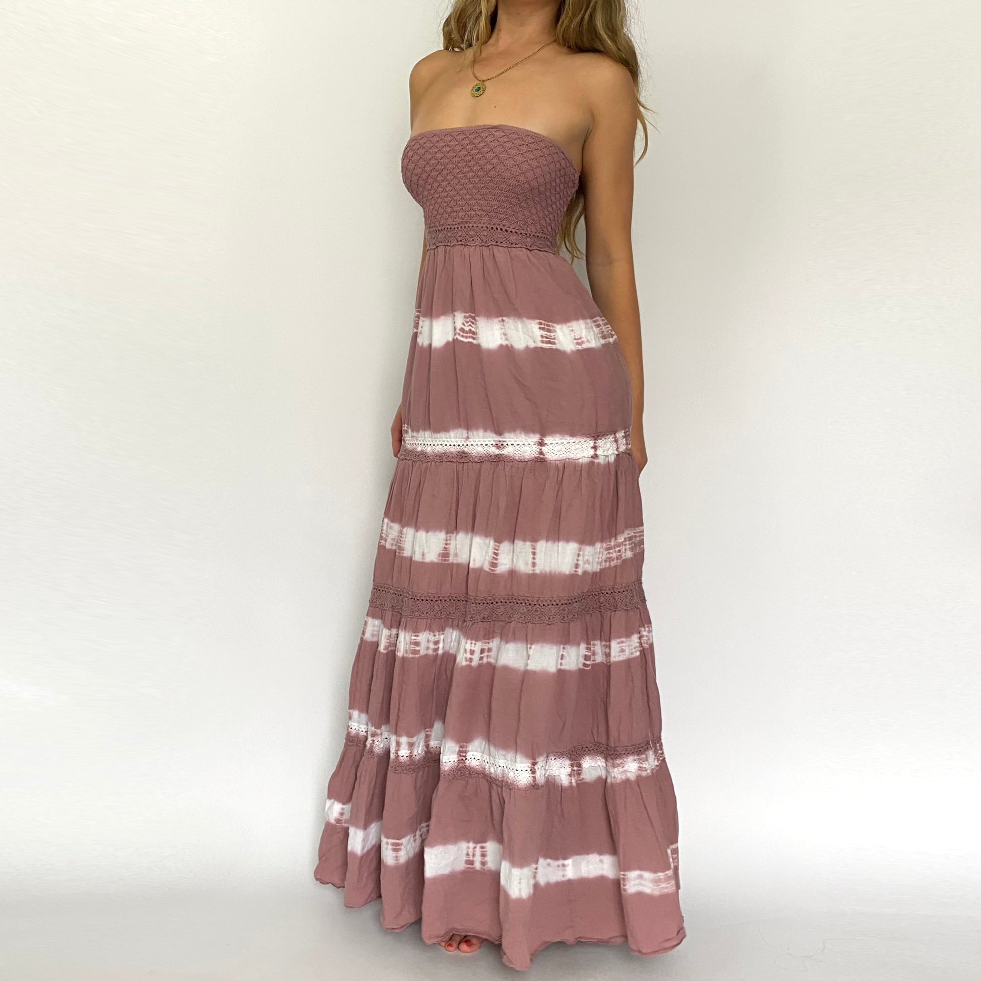 Late 90’s early 2000s Bebe crochet & linen maxi dress. Dusty grape tie dye linen and crochet fabric. Elastic stretch strapless bust-line clings well with a tiered linen maxi hem. Crochet trim detailing, double lined linen skirt. By Bebe, made in USA. In great vintage condition.