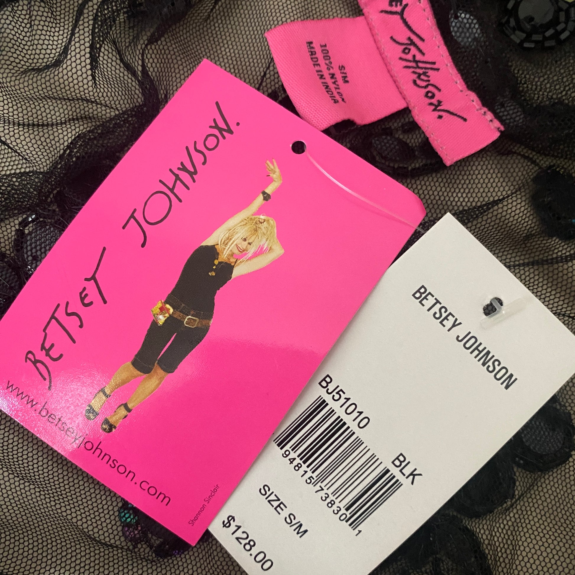 Early 2000s Betsey Johnson beaded sheer mesh bolero. Hook and eyelet front closure with a scalloped hem. Intricate Floral beading embellished throughout. In great deadstock condition.