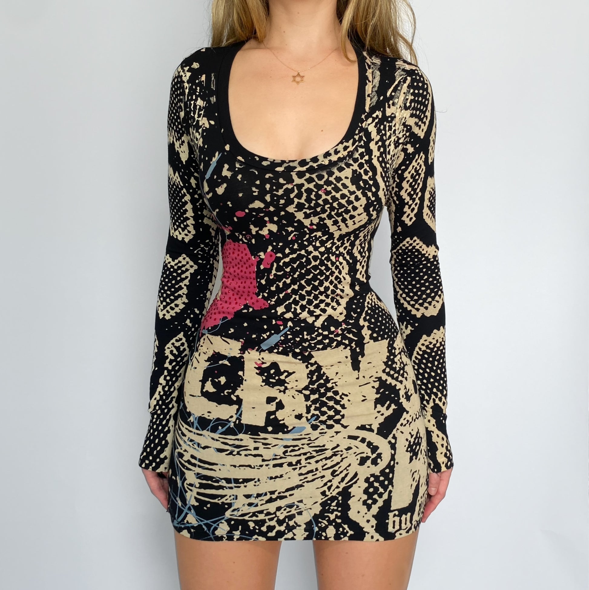 2000s Crystal Rock by Christian Audigier graphic longsleeve mini dress. Snakeskin all over print with a locket heart, wings and logo graphic throughout. Pink bedazzled detailing. Organic cotton fabric. Made in USA, in great deadstock condition.