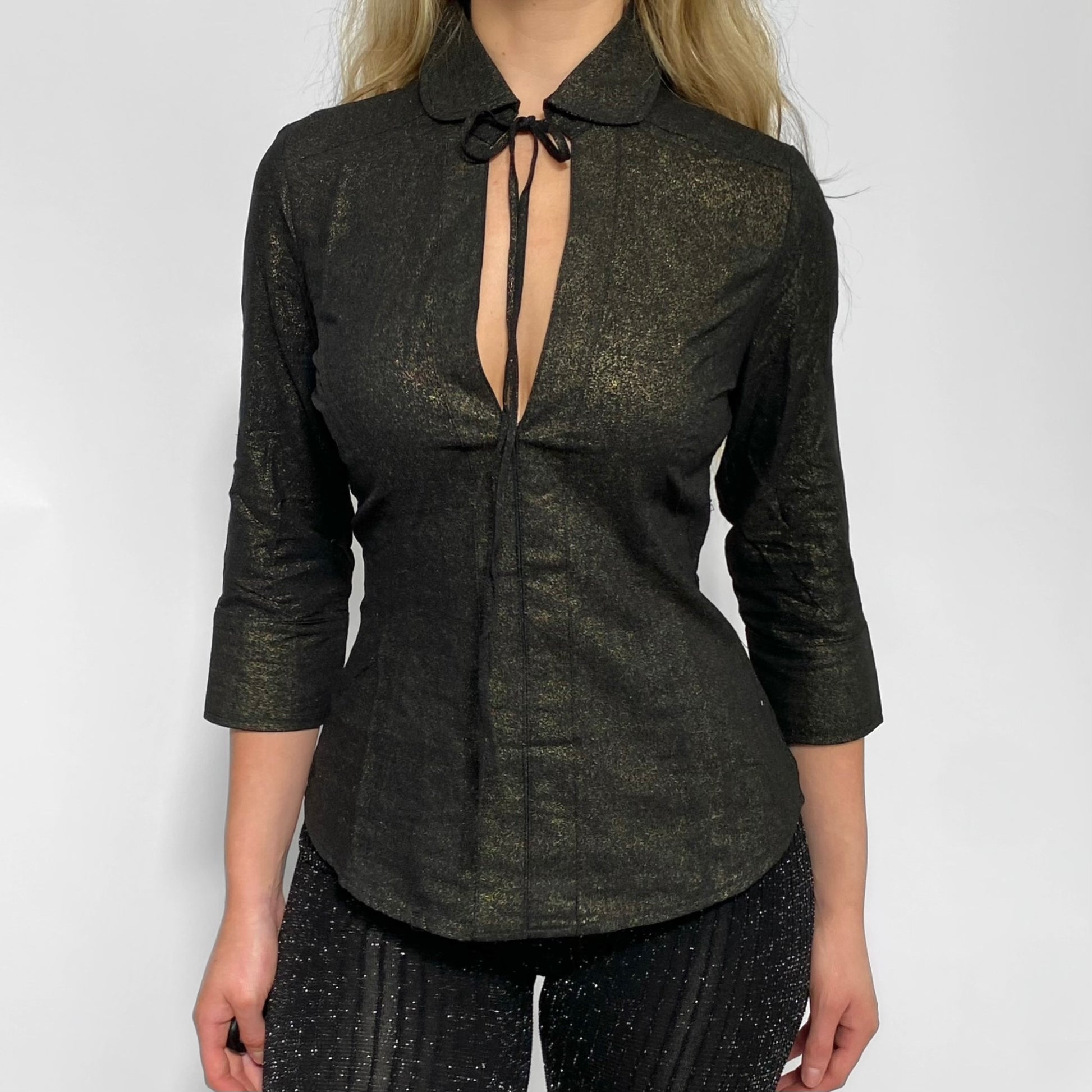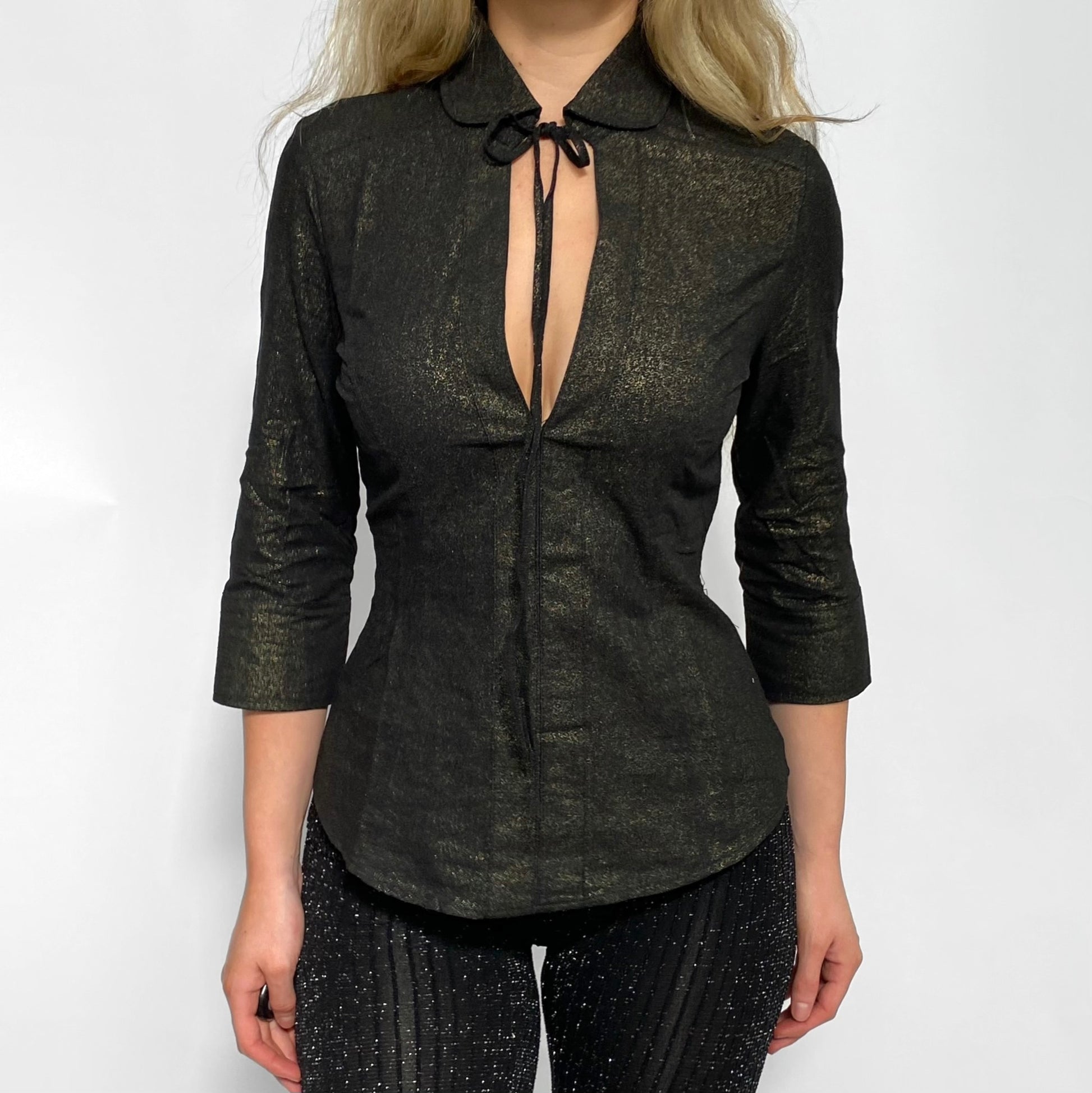 Early 2000s collared keyhole top. Black with gold shimmer 100% cotton fabric. Adjustable ties at cutout v neckline. Three quarter buttoned sleeves. Slim fit. In great condition.