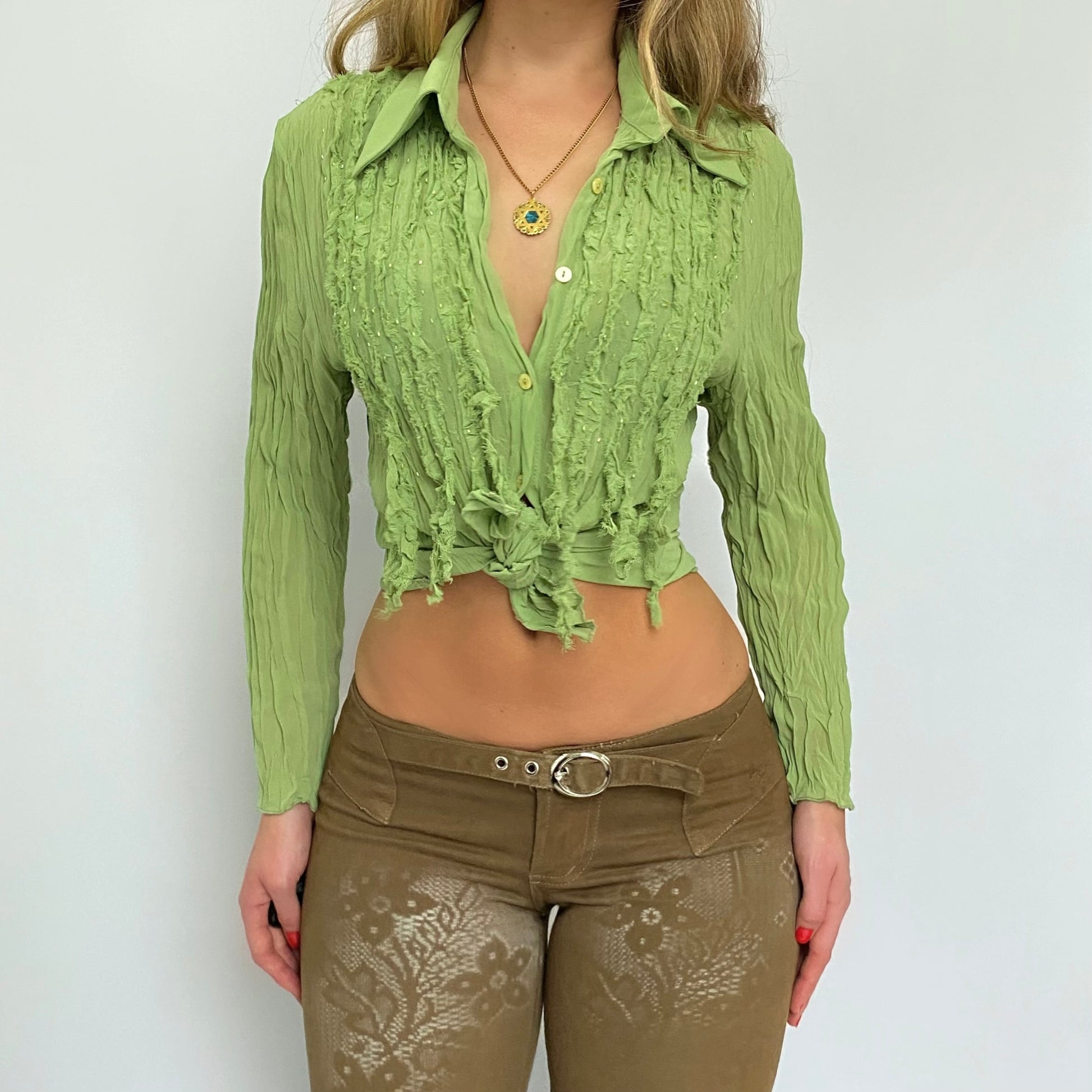 Early 2000s green beaded chiffon blouse. Textured lightweight semi sheer fabric. Beaded embellishments with tassel fringe detailing the chest. In great condition.