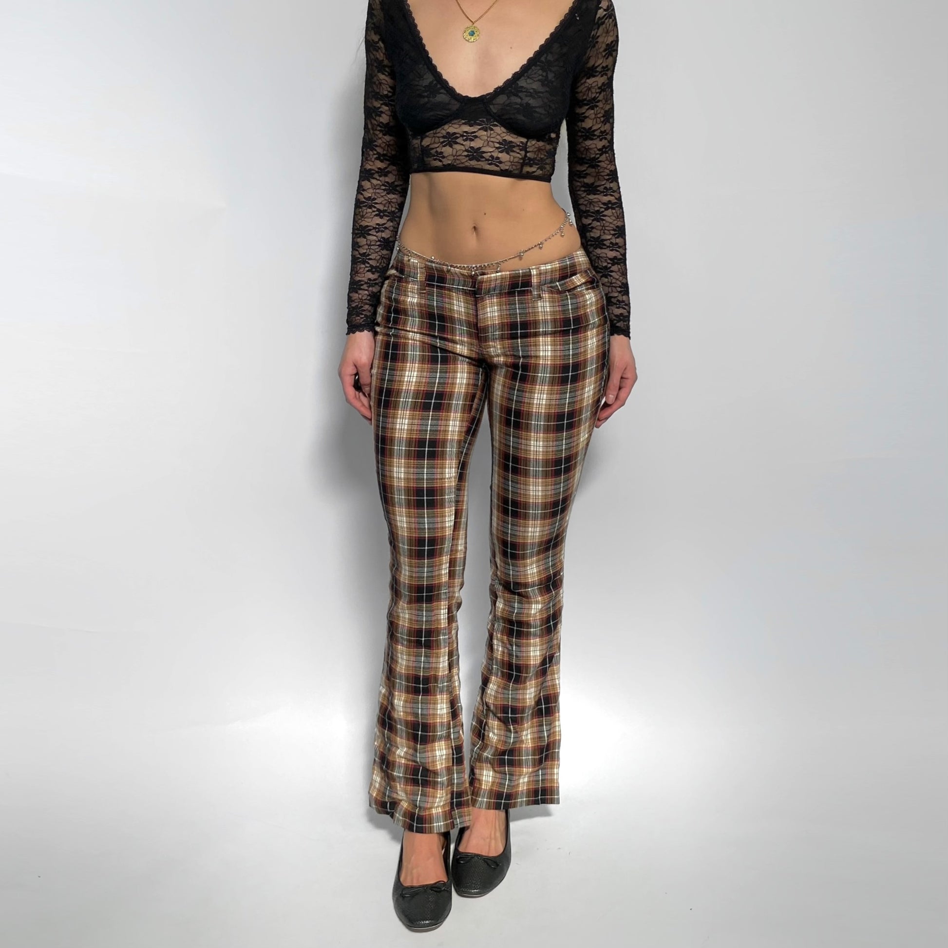 Early 2000s low rise plaid kick flared pants. Zip-hook front closure with dual front pockets. Wool, rayon, nylon fabric blend has some stretch. In great condition.