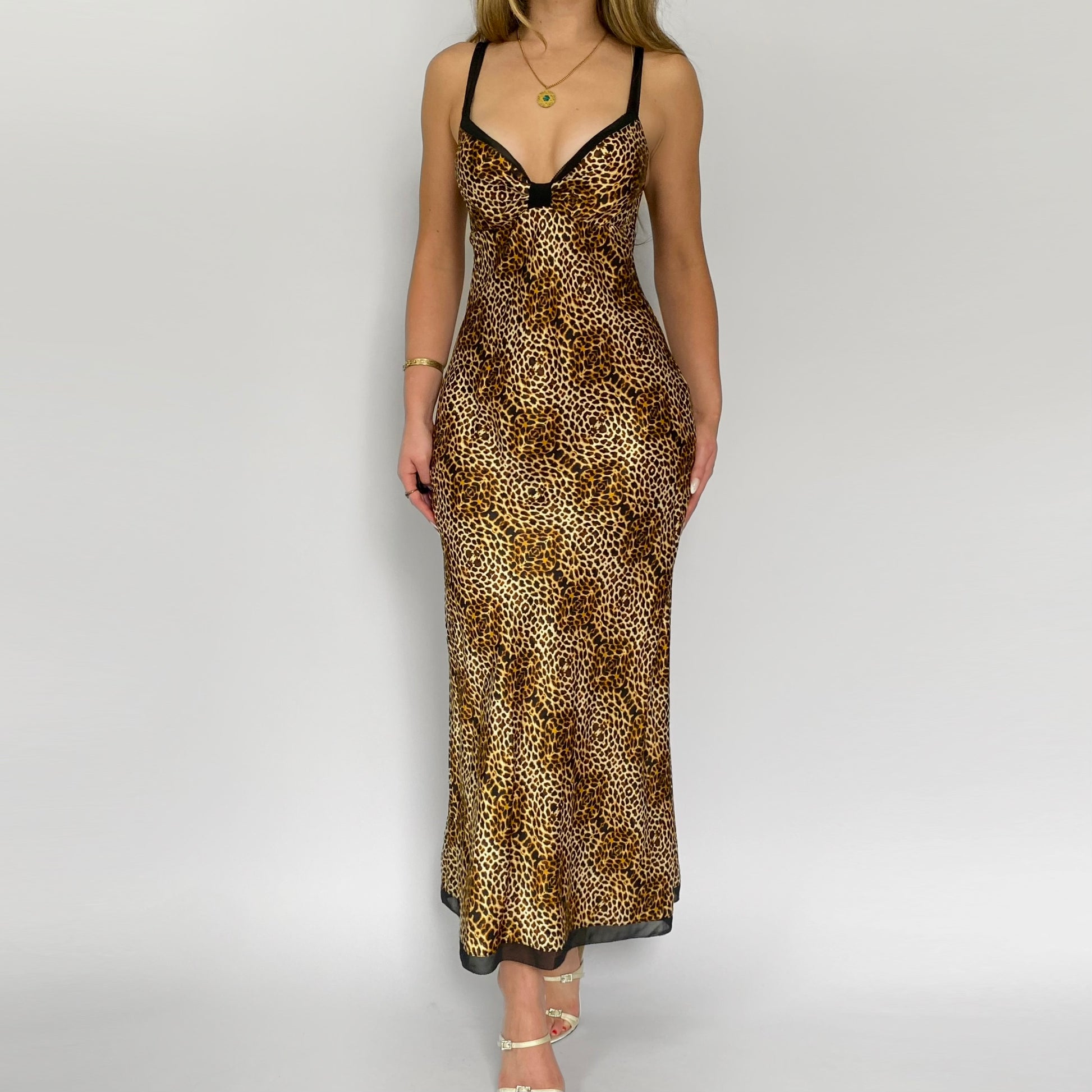 Late 90’s / early 2000s Oscar De La Renta animal print slip gown. Leopard print satin throughout with silk black mesh trim. Adjustable tank straps and scooped bustline. Long maxi length. Pink label, in great condition.