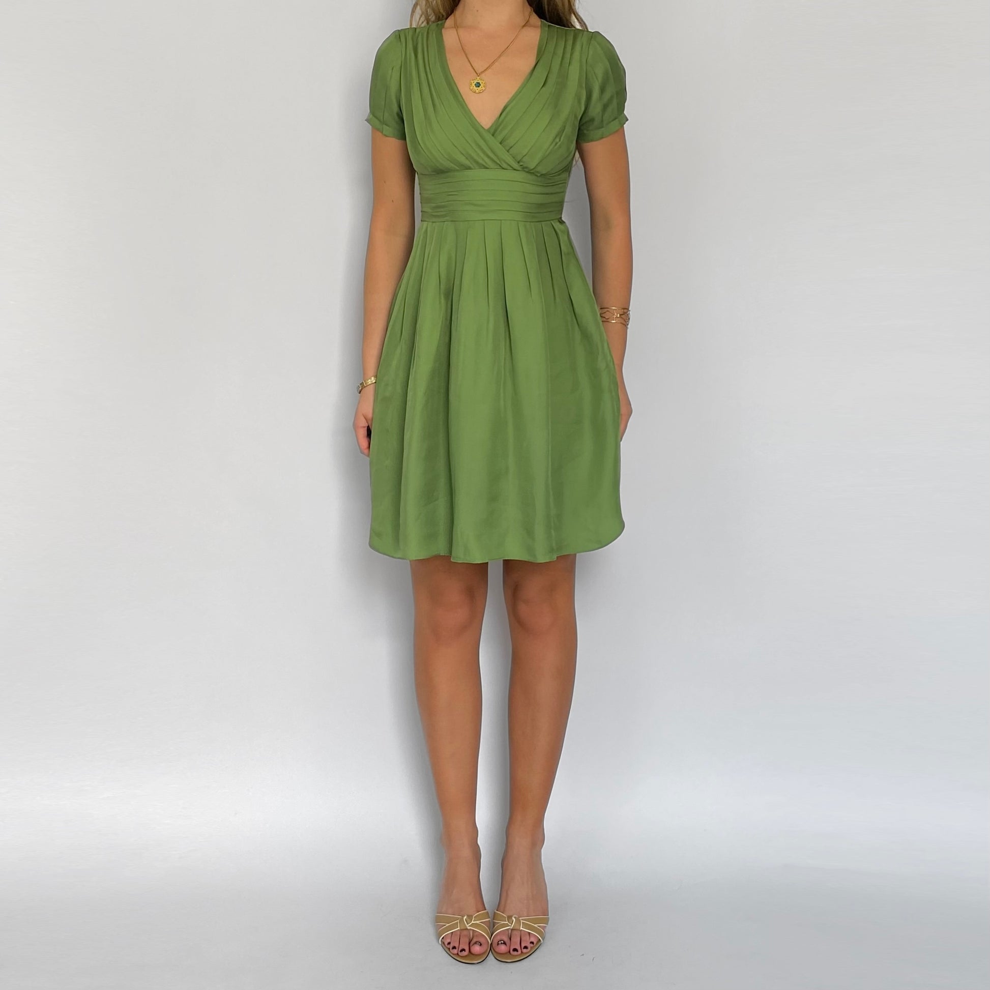 2000s green silk mini dress. Pleating at bust, sleeves & waistline. Smooth 100% silk fabric drapes to the body resting mini length. Hidden side zip closure. By Banana Republic, in great condition.
