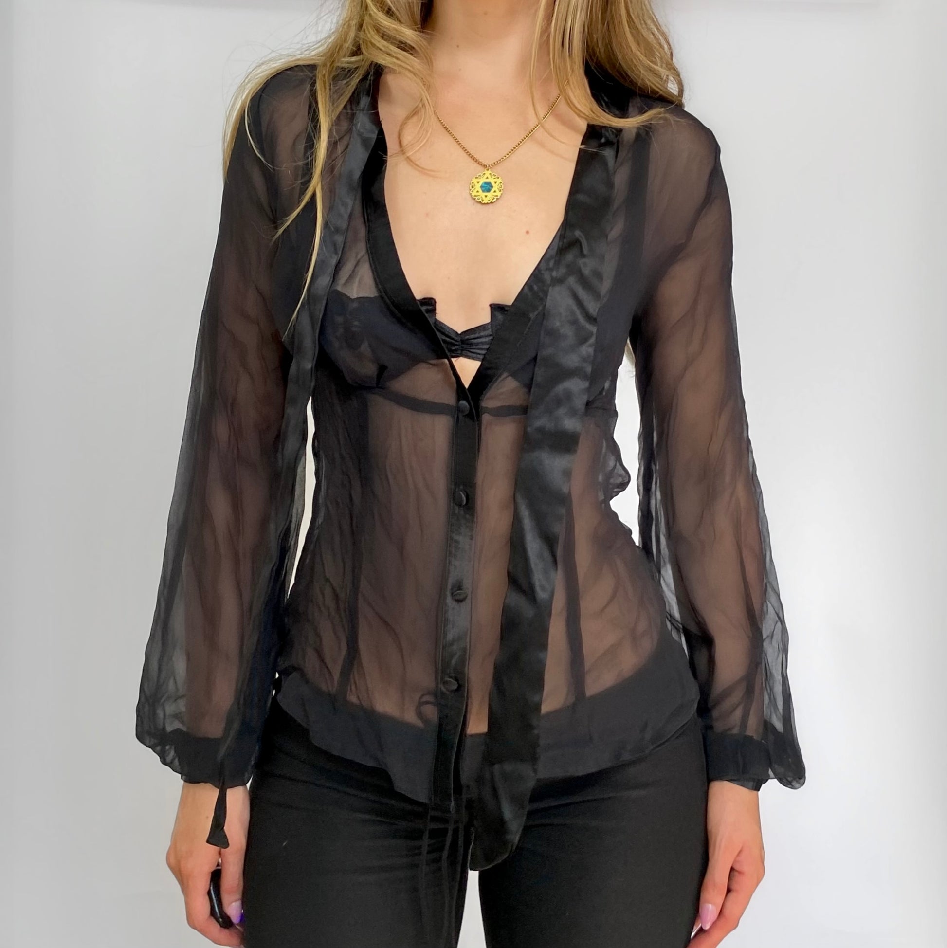 Early 2000s button-up silk tie blouse. 100% silk chiffon sheer black fabric. V-neckline with adjustable ties at neck. Button up front closure with wide relaxed long sleeves clasping at the wrists. In great condition.