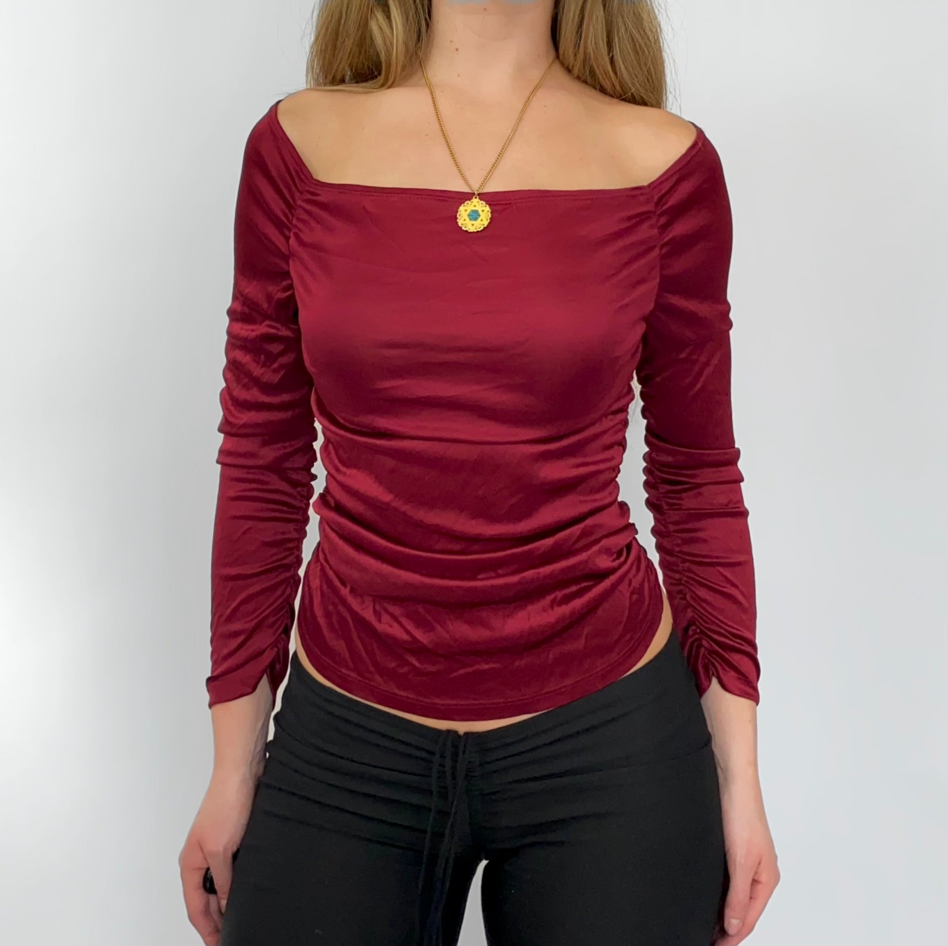 Early 2000s wine red off the shoulder bardot top. Sheen burgundy slinky stretch fabric fits slim with ruching. Made in USA