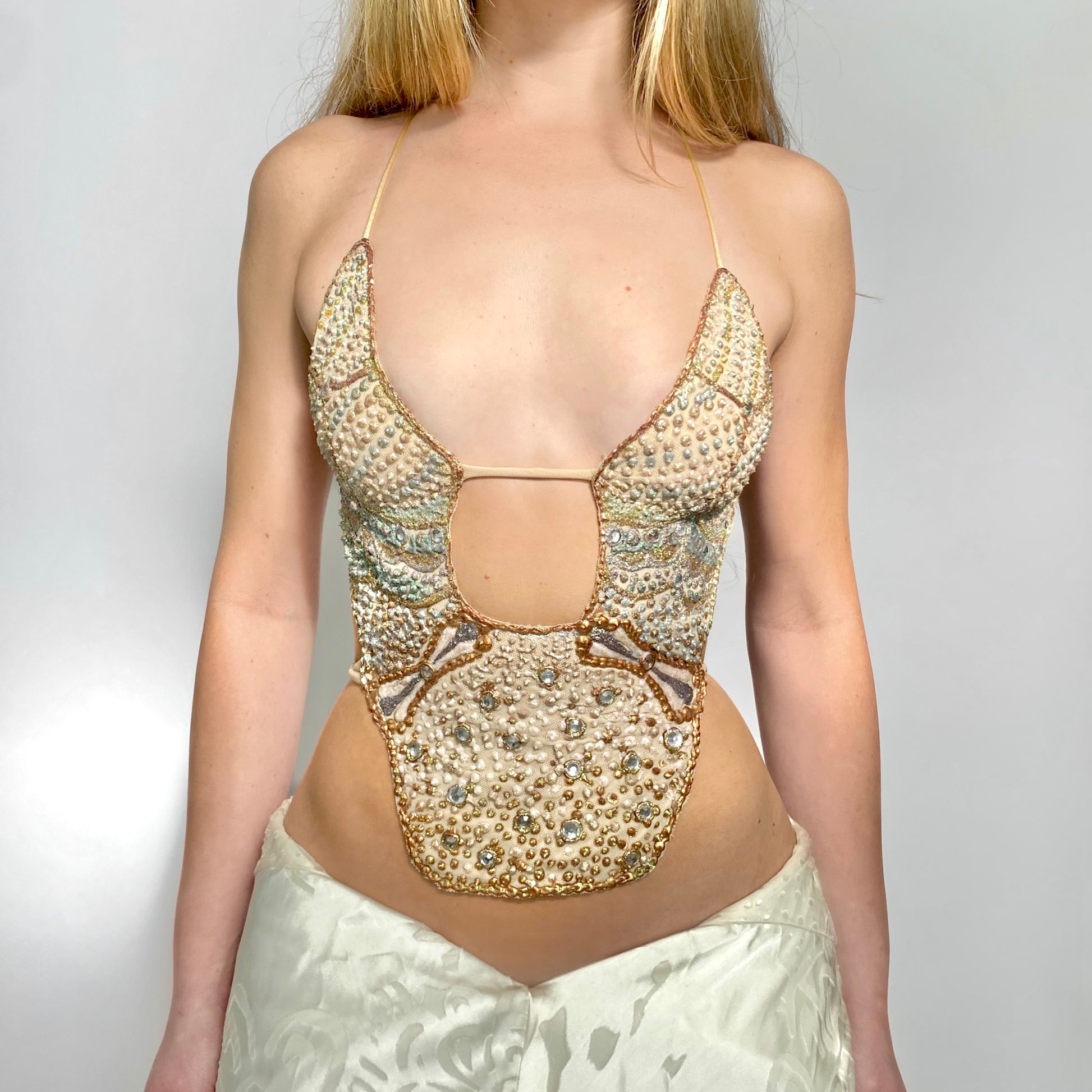 Plunging cutout neckline meets adjustable halter lace-up ties - cinching the waist and can be styled multiple ways. Dimensional painted design with diamanté and sparkly details. Painted fabric softens with body heat, molding to your shape over time.