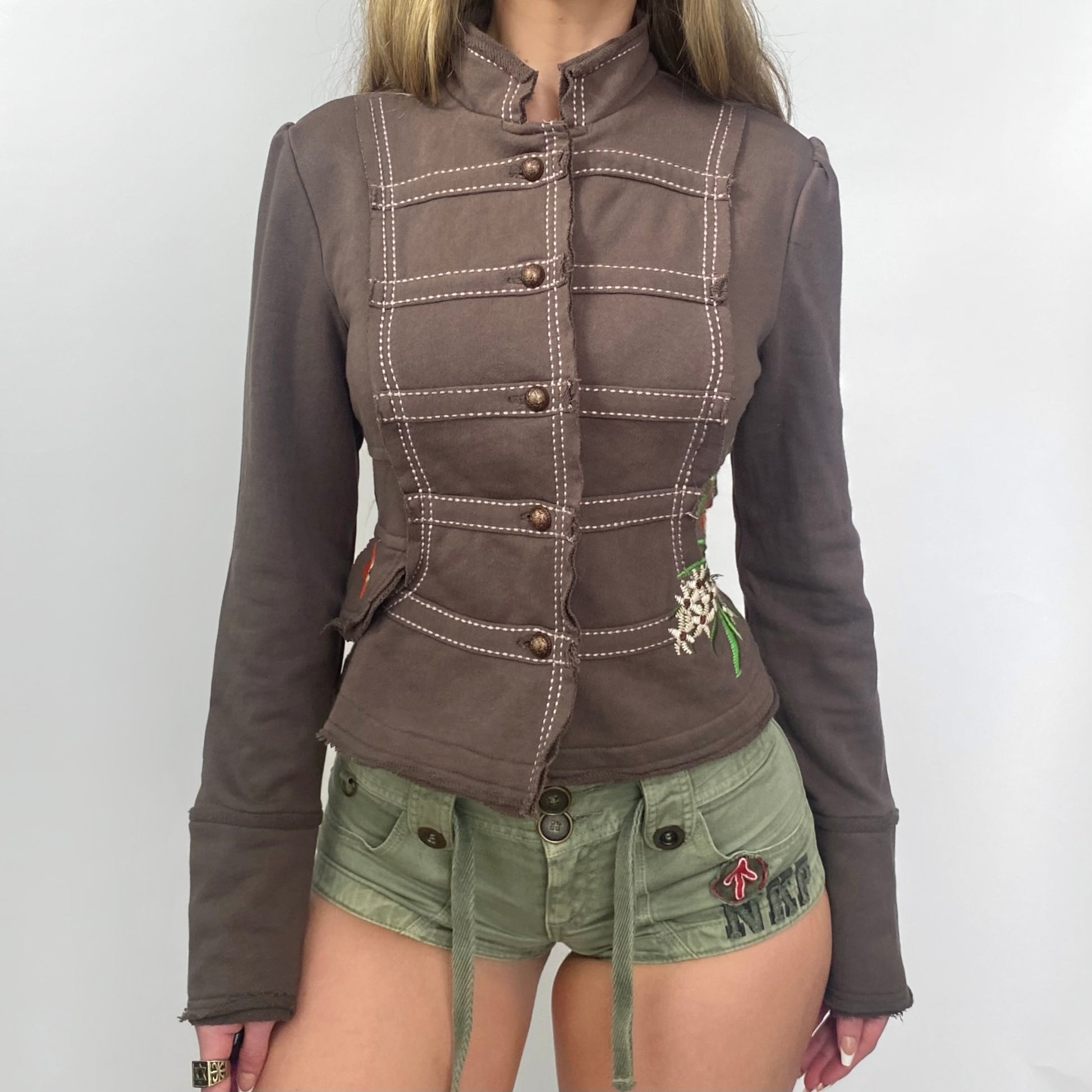 Early 2000s floral embroidered captains jacket. Olive-grey 100% cotton fabric is soft and comfortable with stretch. Button up front with a mock neckline. In great condition.