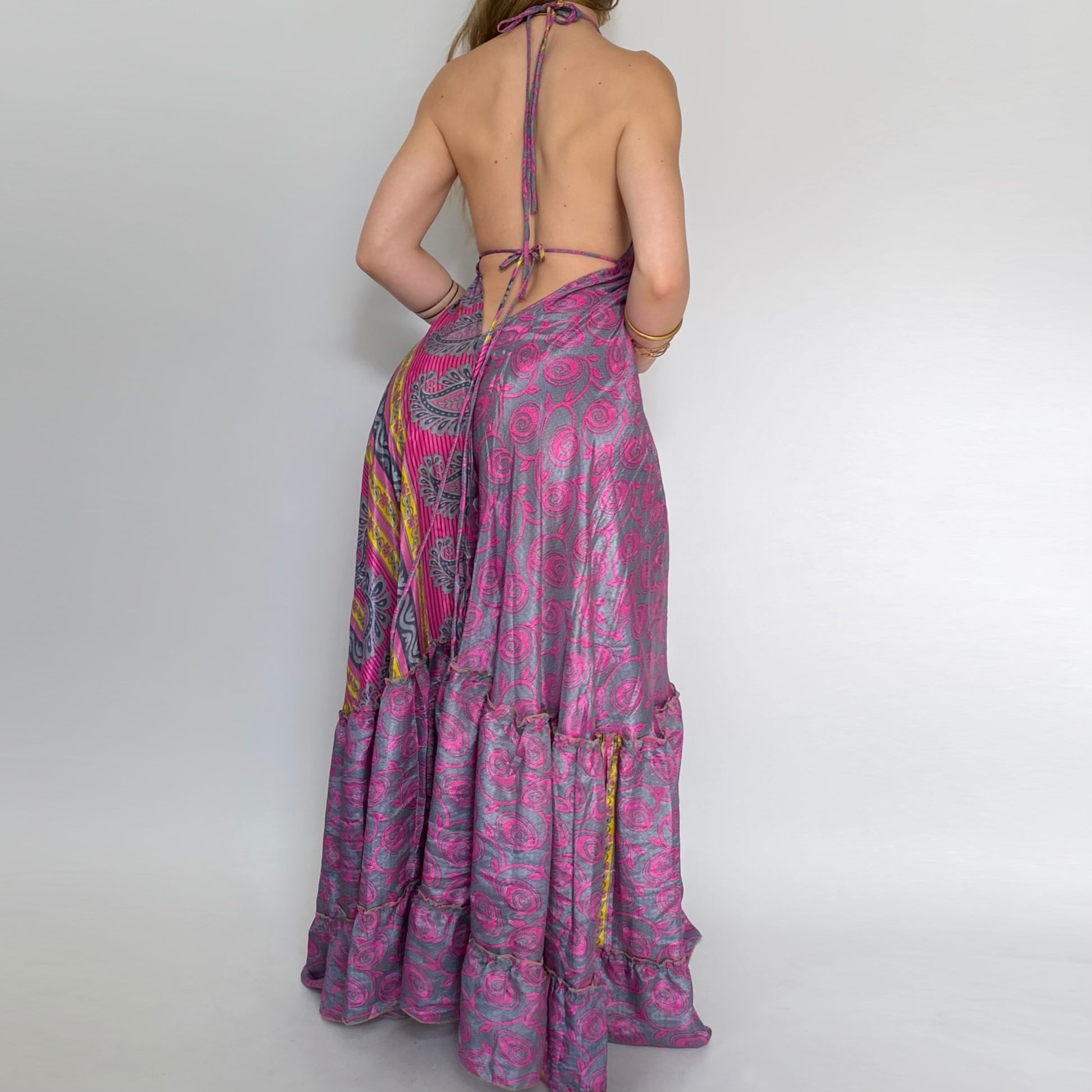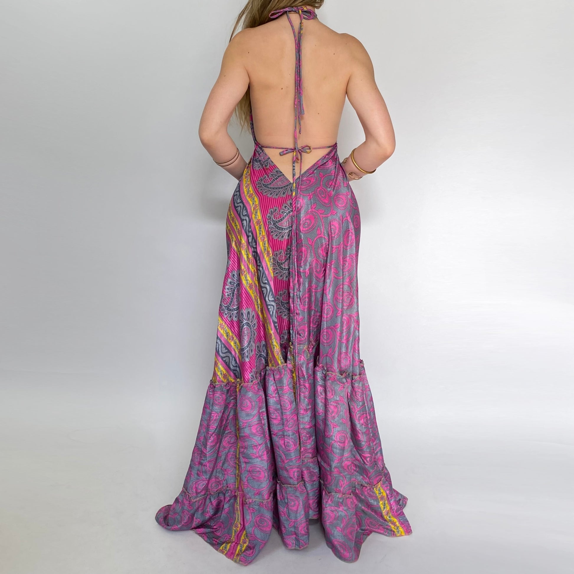Wildflower backless maxi dress. Adjustable halter neck ties and ties at the bust-line with a deep v scooped open back (can be tied various ways). Light weight vintage sari silk fabric drapes resting floor length.